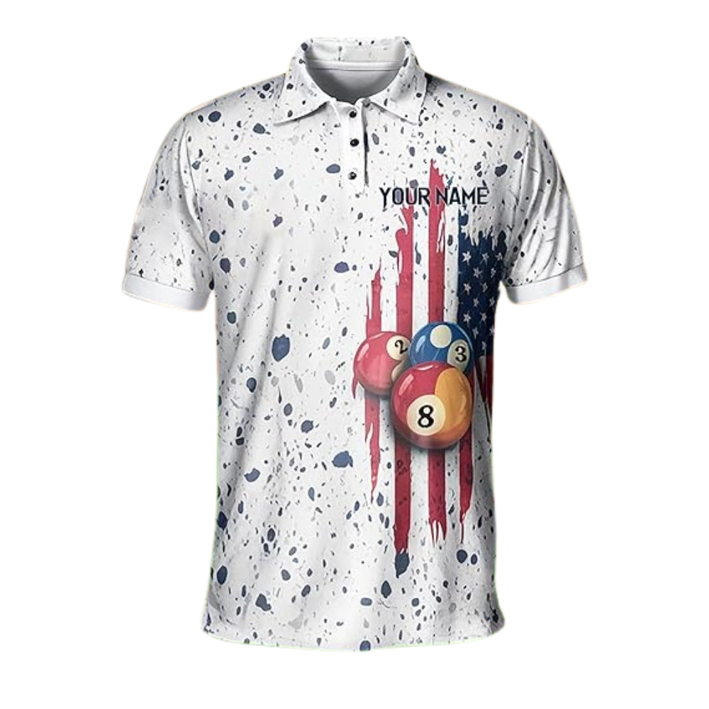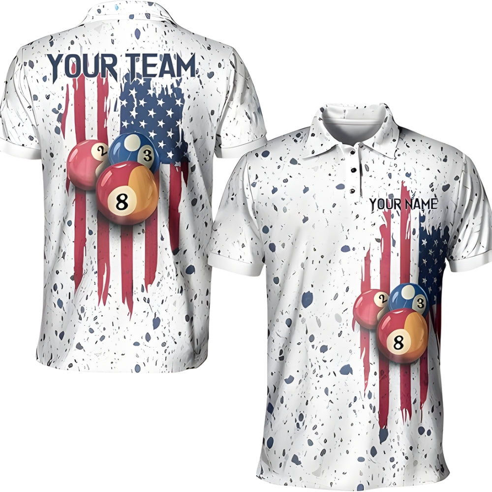 This polo stands out with a unique, eye-catching design. The front showcases a bold combination of white with splattered paint textures, featuring the American flag pattern and a cluster of billiard balls (number 8, 2, and 3) for a dynamic and modern look. The back highlights the same striking flag-inspired motif with the three balls prominently displayed, complemented by a strong team name “YOUR TEAM” above and your custom name on the front. The overall design blends patriotism, energy, and personality - perfect for players who want to stand out on and off the table.