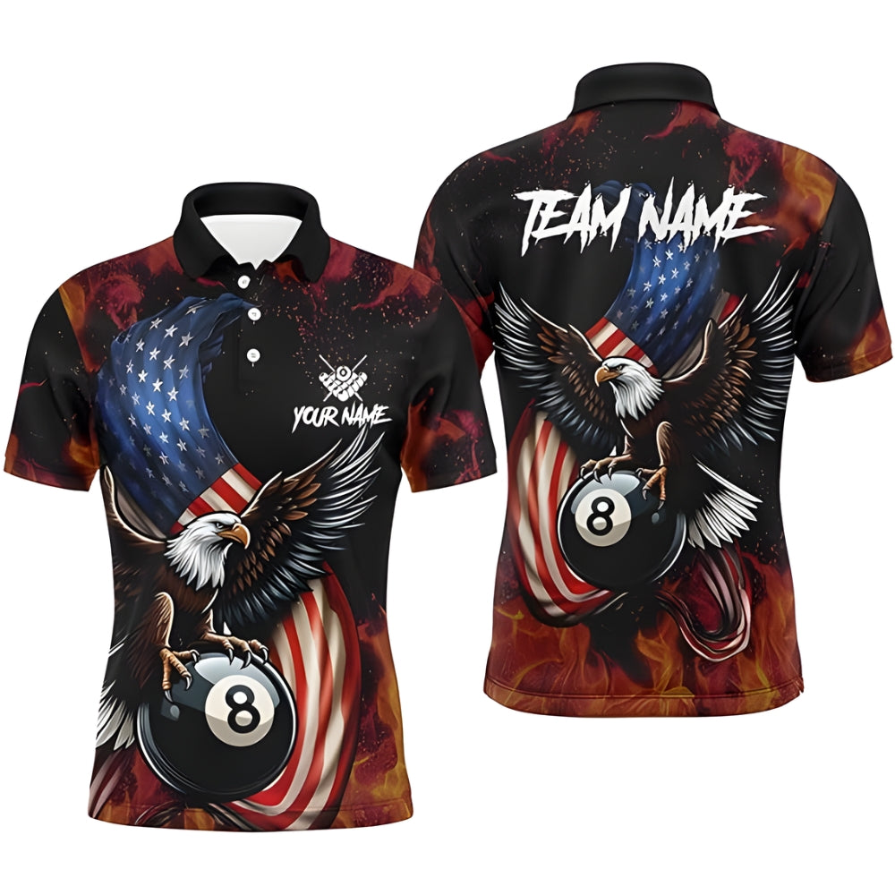 This polo stands out with a bold and eye-catching design. The front showcases a powerful American eagle clutching the iconic number 8 ball, set against a flowing U.S. flag background surrounded by fiery red and orange accents - creating a fierce yet patriotic look. The back continues the dynamic scene with the majestic eagle spreading its wings behind the flag, accompanied by a strong team name “TEAM NAME” above and your custom name displayed proudly on the front. The overall design blends strength, pride, and determination, making it perfect for players who dominate both in style and performance.