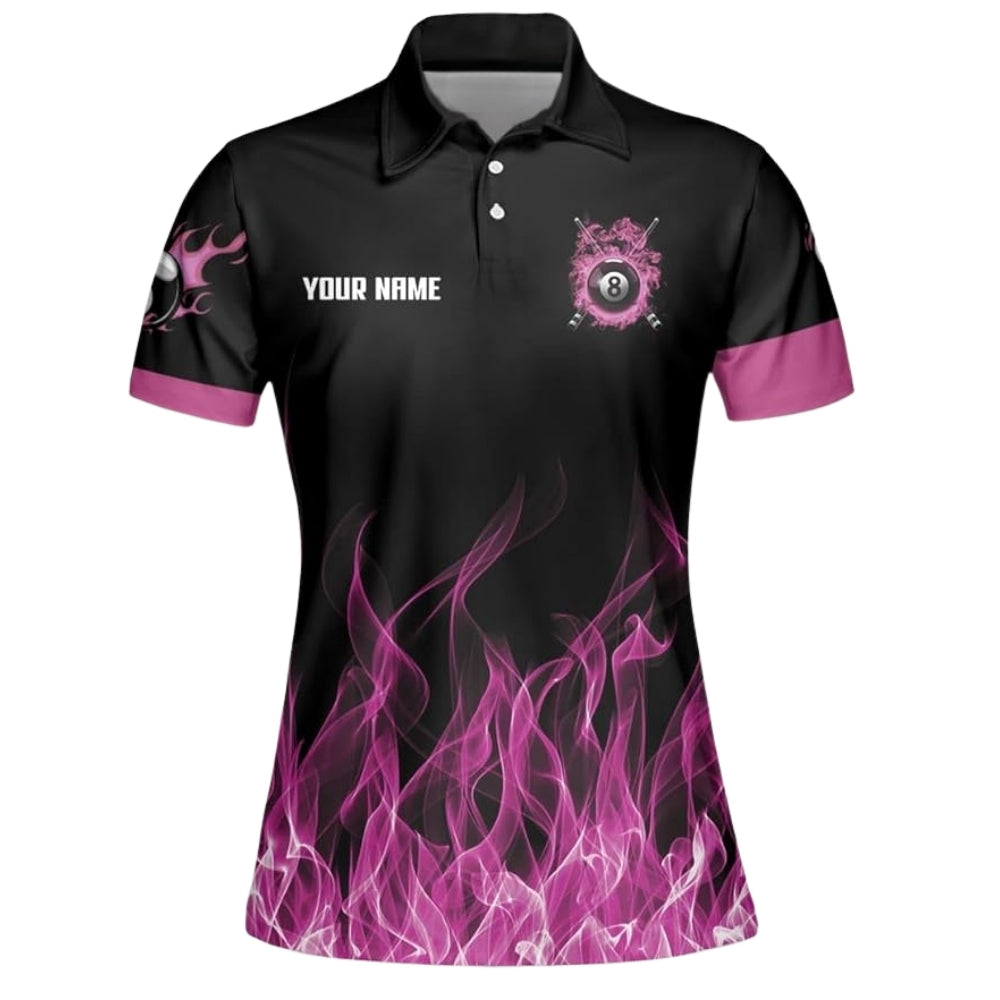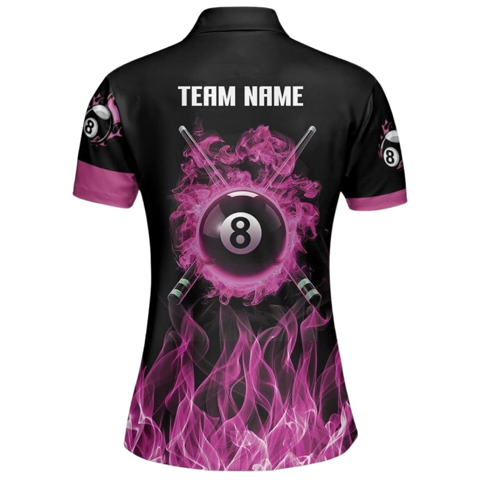 This polo stands out with a bold, feminine twist on a classic billiards style. The front showcases a sleek combination of black and vibrant pink flame effects rising from the bottom, featuring the number 8 ball surrounded by smoky pink energy for a striking and stylish look. The back highlights a large 8 ball engulfed in vivid pink flames with crossed cues behind it, a powerful team name “TEAM NAME” above, and your custom name displayed on the front. The subtle pink flame accents on the sleeves add a touch of sporty flair. Whether you're playing solo or as part of a team, this polo delivers the perfect blend of confidence, style, and attitude.
