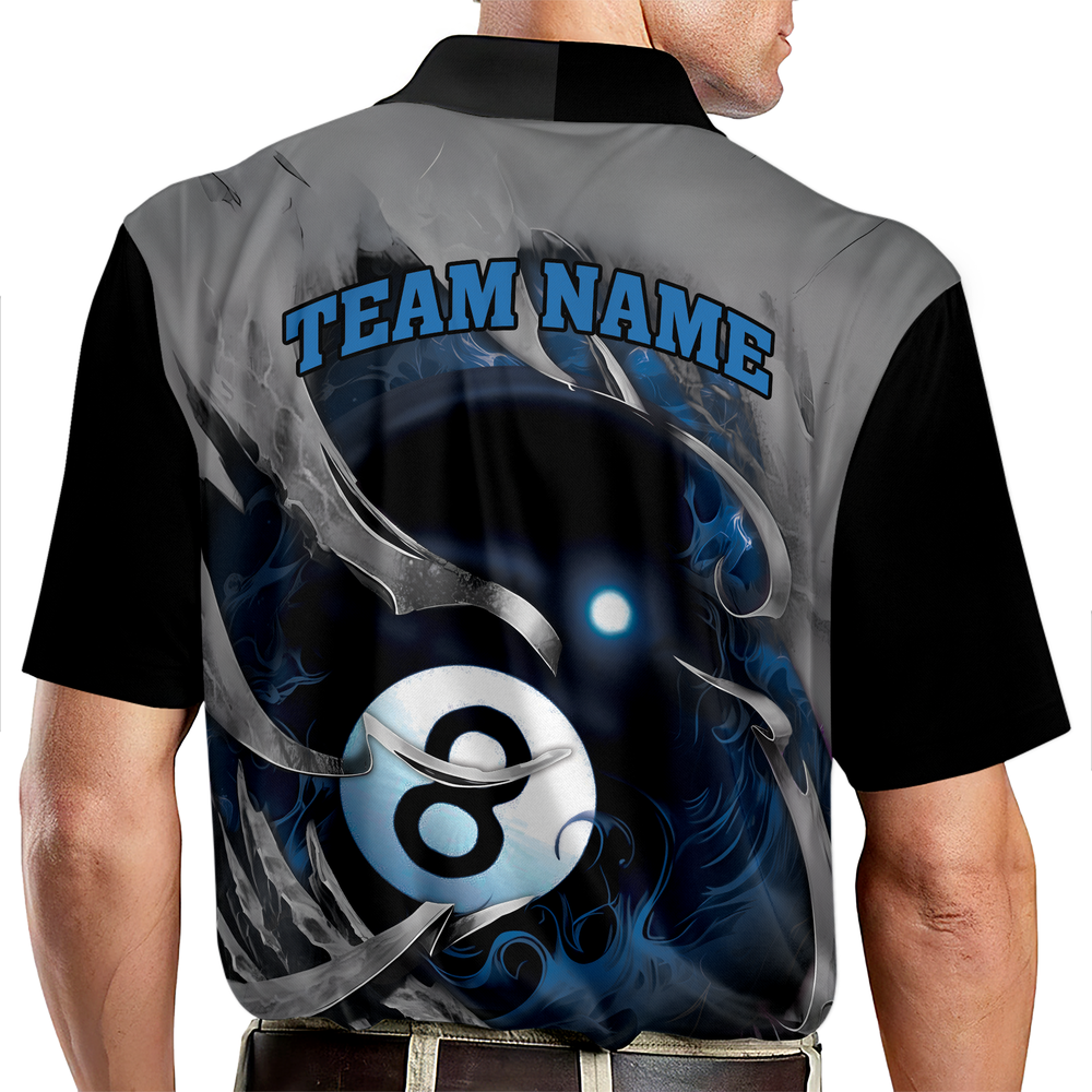 This polo stands out with a fierce and electrifying design. The front showcases a powerful blend of black, gray, and deep blue tones, featuring a menacing skull gripping the number 8 ball surrounded by swirling blue energy for a bold and intense look. The back highlights a large 8 ball enveloped in electric blue flames, with a strong team name “TEAM NAME” above and your custom name displayed on the front. The dynamic smoke and flame effects add depth and motion, giving the shirt a sharp, modern edge. Whether you’re part of a team or playing solo, this polo delivers the perfect mix of attitude, power, and confidence.