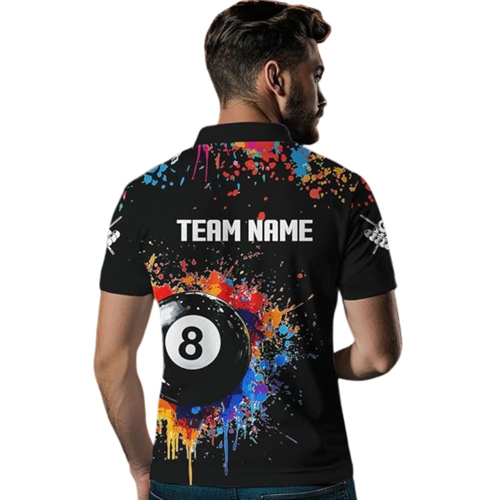 This polo stands out with a unique, eye-catching design. The front showcases a vibrant explosion of multicolor paint splashes against a sleek black background, featuring a bold 8-ball graphic for a lively yet stylish look. The back highlights a larger 8-ball design surrounded by the same dynamic color splashes, with a striking team name “TEAM NAME” above and your custom name on the front. Whether you're part of a team or playing solo, this polo brings the perfect blend of energy, style, and personality.